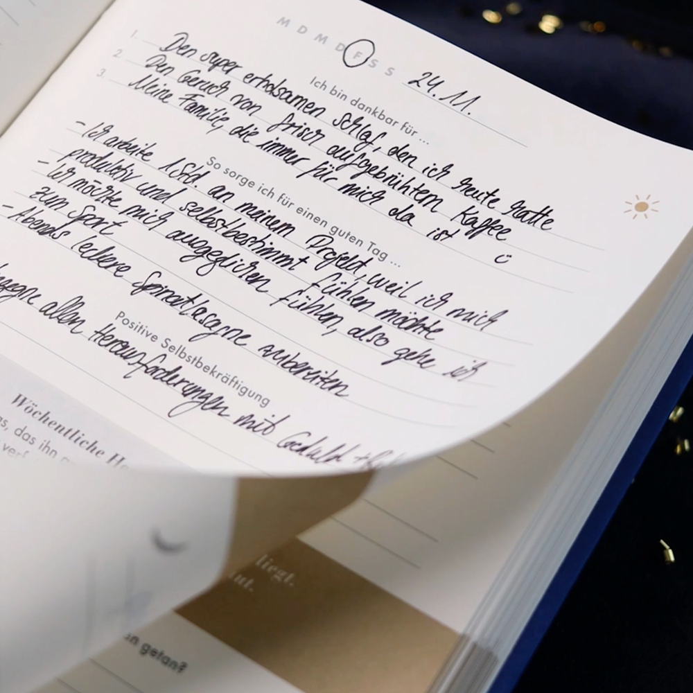 Warum eigentlich das 6-Minuten-Tagebuch? Weil du viel mehr als nur ein Tagebuch bekommst! Unser Original begleitet dich über ein halbes Jahr voller persönlicher Entwicklung und positiver Veränderungen. Ein geführtes Journal, das dich mit klaren Strukturen, Achtsamkeits-Impulsen, wöchentlichen Challenges und inspirierenden Zitaten ganz natürlich in eine dauerhafte Dankbarkeitspraxis führt. Und damit in ein glücklicheres Leben.