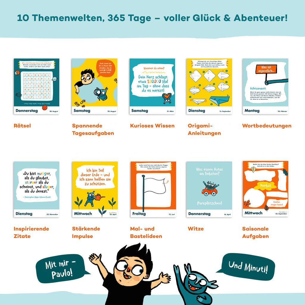 Mit dabei sind auch die beliebten Charaktere Paulo, Minuti und Cleo aus dem 6-Minuten-Tagebuch für Kinder, die den Kalender zu einem vertrauten und inspirierenden Begleiter für Kinder ab 6 Jahren machen.