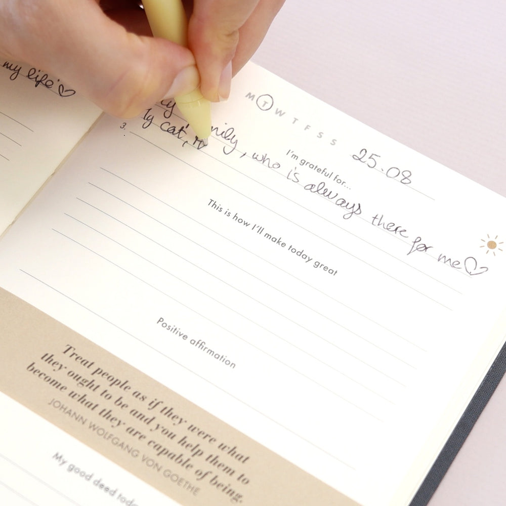 Das 6-Minute-Diary PURE ist für alle, die mehr Achtsamkeit, Dankbarkeit und Freude erleben möchten – ganz gleich, wo sie gerade stehen. Ein wunderschönes Geschenk in Premium-Qualität. Auf dieser Seite bekommst du die englische Version, hier geht's zum 6-Minuten-Tagebuch PUR auf deutsch.