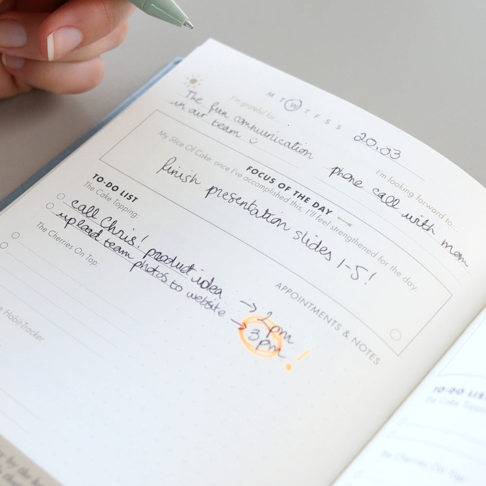Mit dem Journal richtest du dich morgens bewusst auf deine wichtigsten Ziele aus und kannst im Laufe des Tages alles abhaken. Du lernst dadurch, dich auf das Wesentliche zu konzentrieren, klare Prioritäten zu setzen und dich nicht von To-dos oder Ablenkungen überrollen zu lassen.